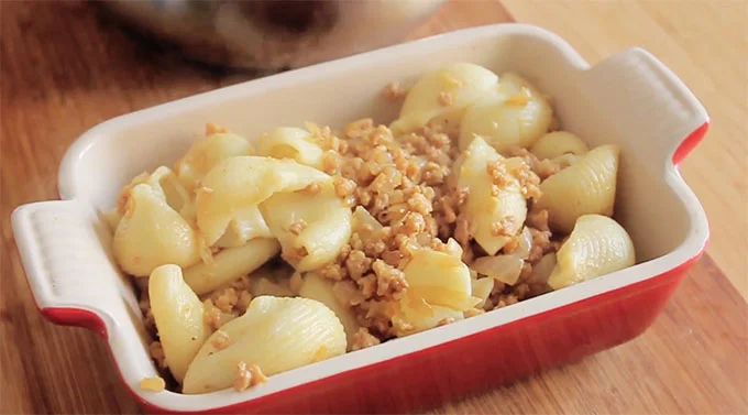 - Mezclamos los galets con la carne picada vegana y añadimos un puñado de nueces troceadas.